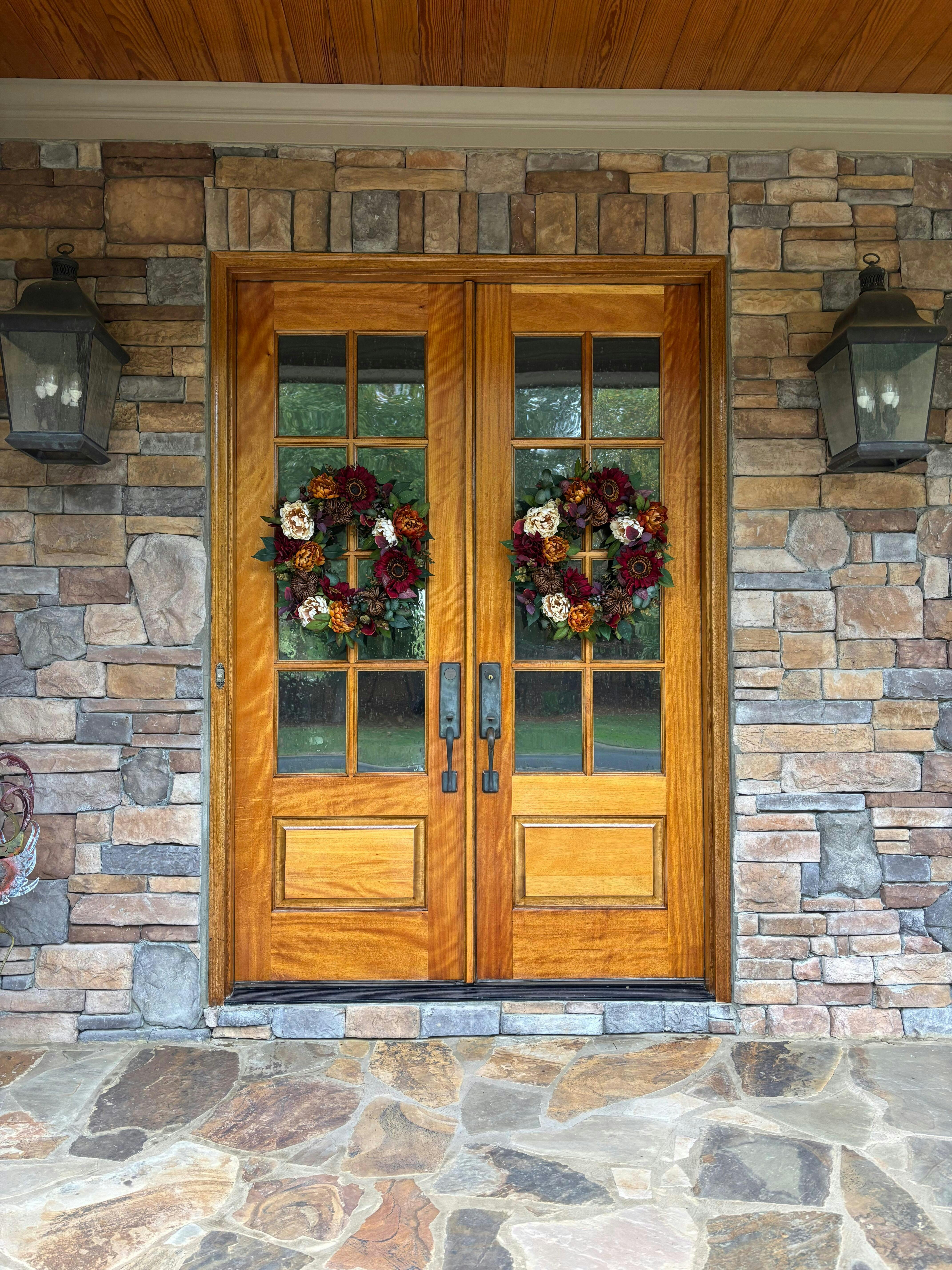 Add a touch of autumn splendor to your home with our "Queen Autumn" wreath! Featuring vibrant maroon sunflowers, gold and cream peonies, and grapevine pumpkins, this wreath will bring rich colors and volume to your decor. Perfect for fall festivities and everyday use.